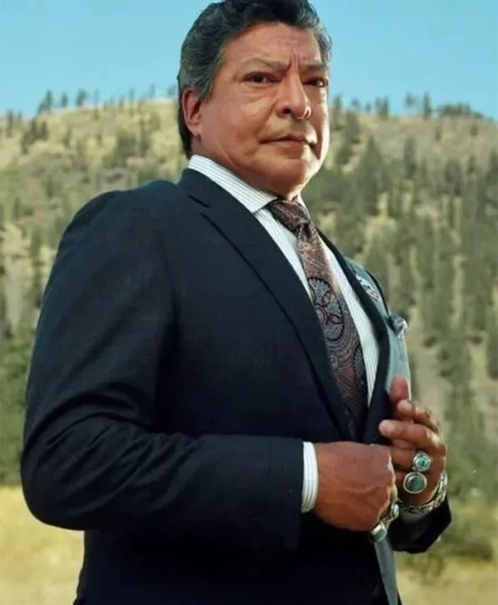 Embrace the self-assured appearance of Gil Birmingham’s portrayal of Thomas Rainwater in Yellowstone Season 5 by donning this black blazer . This men’s blazer has a structured silhouette without sacrificing comfort because it is made of a traditional suiting fabric. perfect for embracing the seasonal changes.